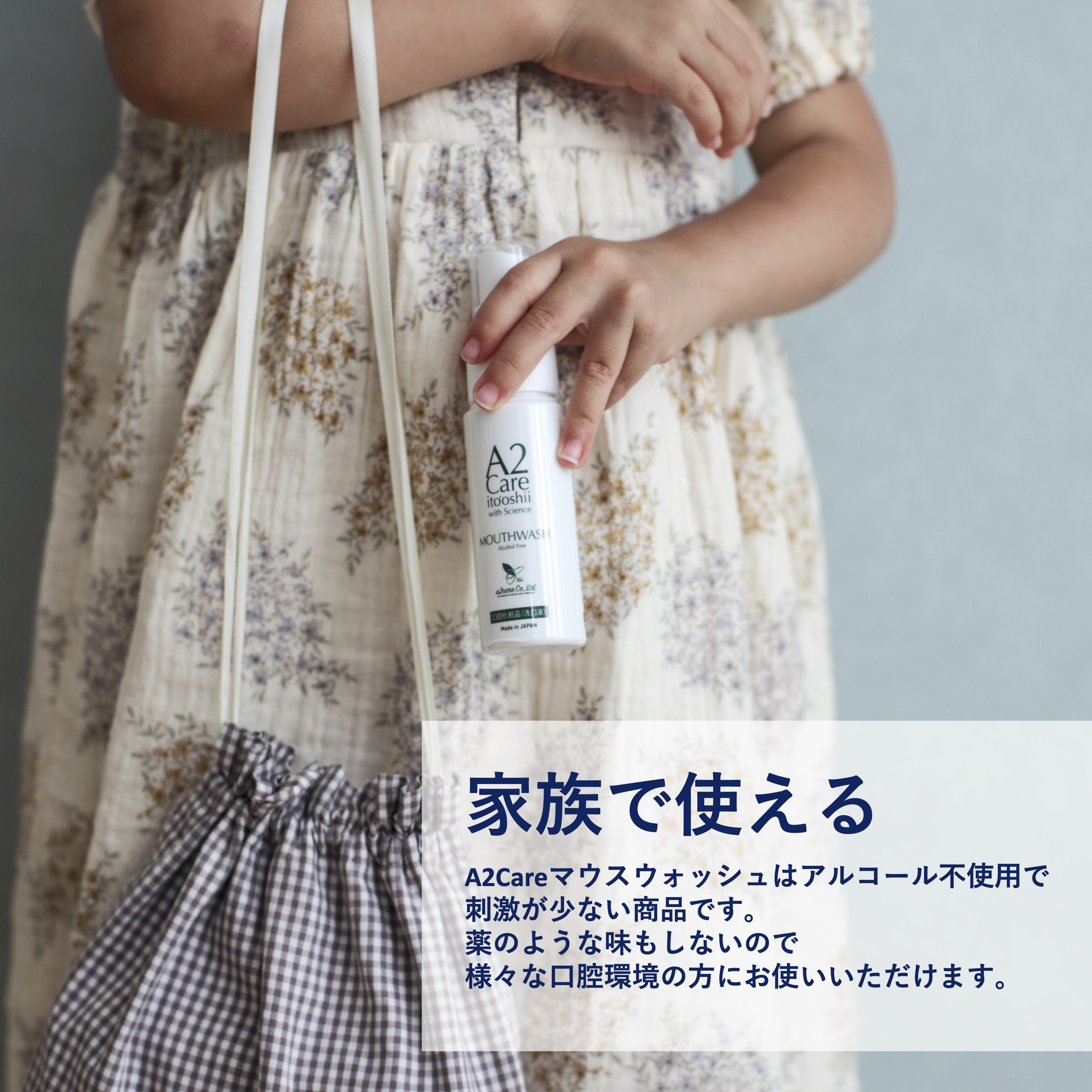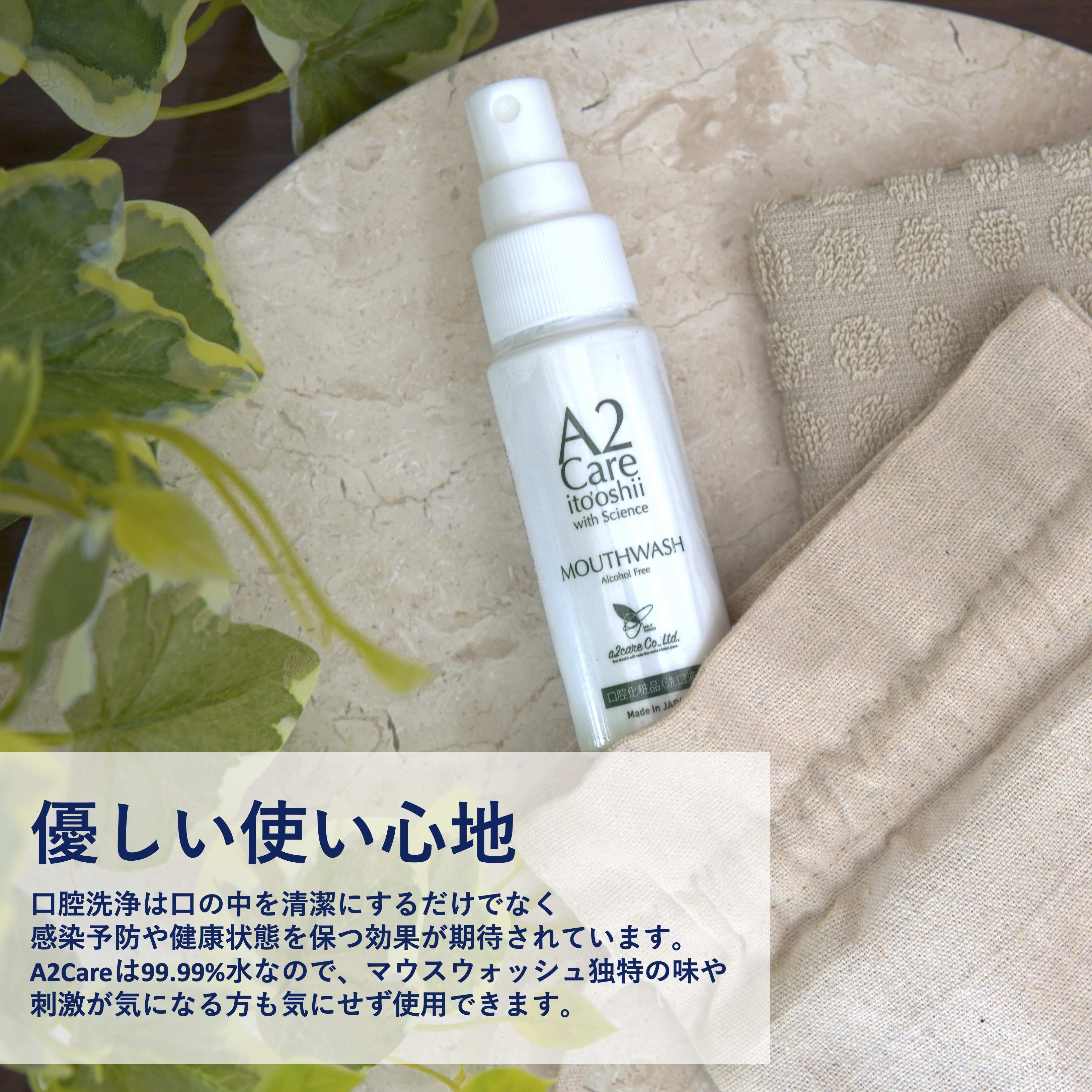 A2Careマウスウォッシュを使用することによって口腔内を浄化し、口臭を防ぎます。アルコール・エタノール、ミント・ハッカなどは