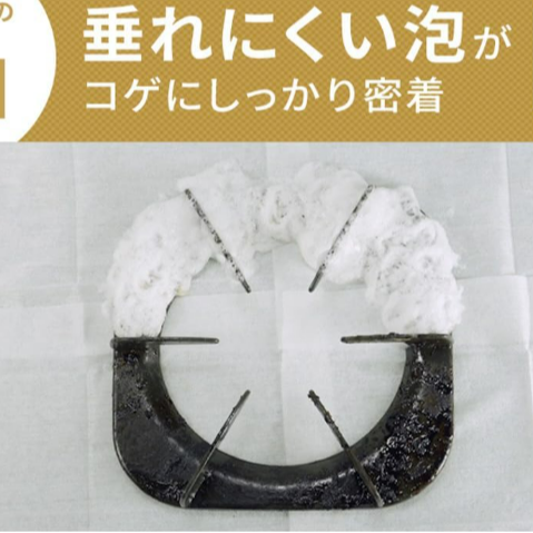 【泡がしっかり密着、汚れの奥まで浸透!】タレにくい泡がコゲに密着し、界面活性剤が溶剤の浸透を助けます。 重なった汚れの奥まで入り込み、しっかり分解・剥がします。