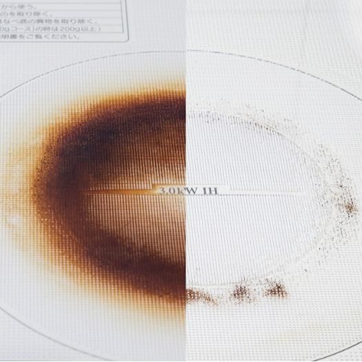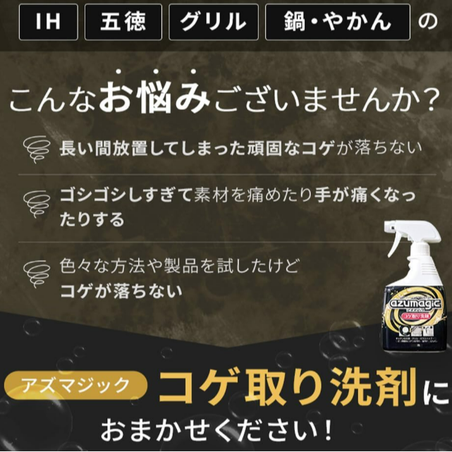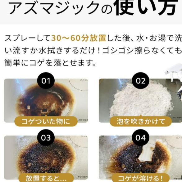頑固なコゲがこすらず落ちる!】薬液をかけ、放置後は水かお湯で洗い流すか、水拭きするだけ。 固まって落ちなかったコゲ・油汚れを、こすらずにスルッと落とすことができます。
