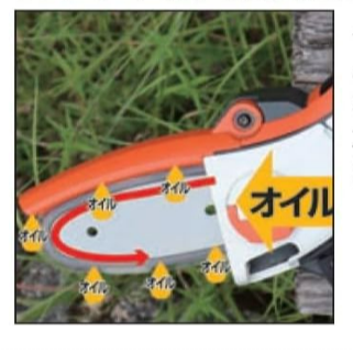 オレゴン社製チェーンとバーを採用。毎秒8.5mのチェーンスピードで素早く切断が可能。チェーンオイル自動給油機能付き、オイル注油が不要です。工具無しでチェーン調整・交換が可能