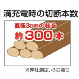 ●モーター:ブラシモーター●バッテリー:リチウムイオンDC18V2.0Ah●充電時間:約60分●作業量:Φ30ミリ×300本(杉、弊社測定値)●ガイドバー:100ミリ(有効切断長70mm)●チェーンスピード:8.5m/s(毎秒)●チェーン形式:80BX-26