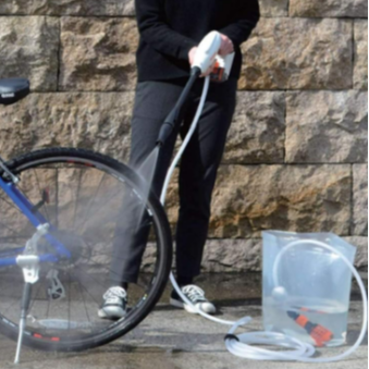 バッテリー式だから水道と電源のない場所でも、バケツさえ用意すれば洗浄できます。吸水ホースも付属されており、面倒な水道栓の接続もなく準備が簡単です。