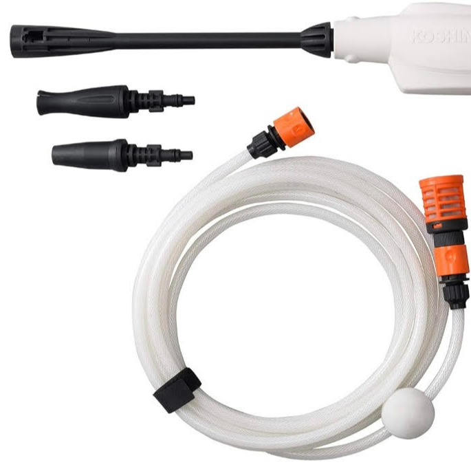 バッテリー式なので電源は不要。必要なものが揃っているのですぐに使えます。ホースの接続も簡単です。